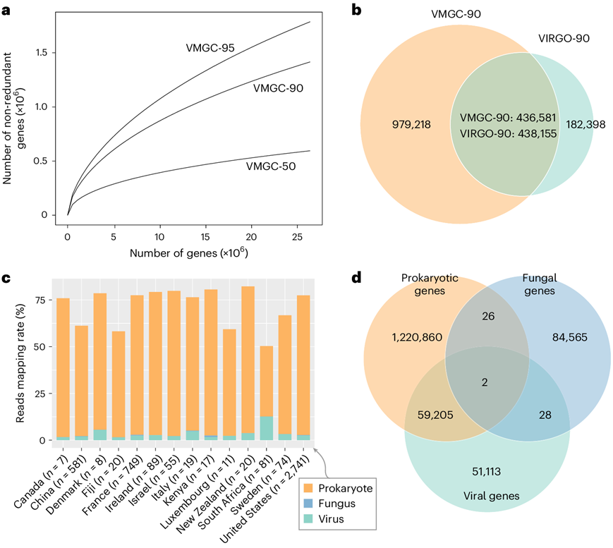 (a) 非冗余蛋白质随取样蛋白质数量增加的积累曲线。(b) VMGC-90与VIRGO-90之间蛋白质的重叠。(c) 对应于VMGC-90的基因目录。(d) VMGC-90中原核生物、真菌和病毒蛋白质的重叠。