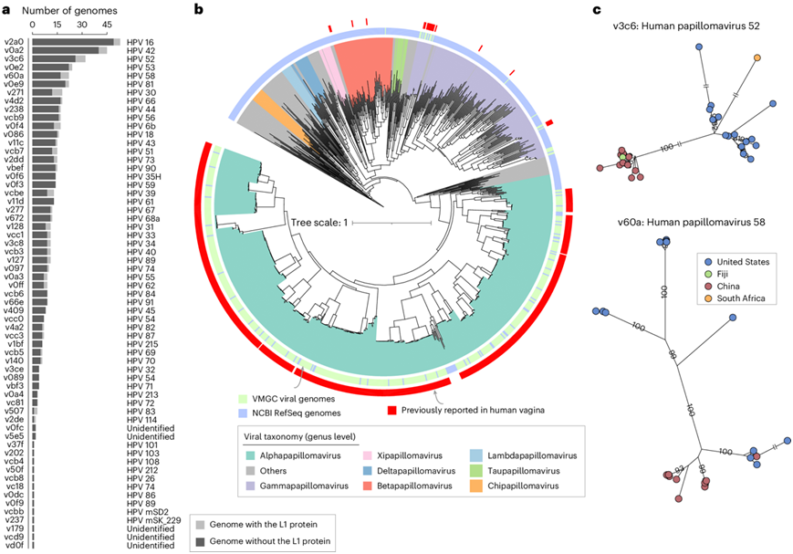 (a) 标注有乳头瘤病毒科 (Papillomaviridae) 的 61 个 vOTU 的基因组数量和 HPV 分型。 (b) 基于 VMGC 和 NCBI RefSeq 数据库中所有乳头瘤病毒科基因组的 L1 蛋白的系统发育树。(c) 基于 VMGC 中 HPV52 和 HPV58 基因组的系统发育树。