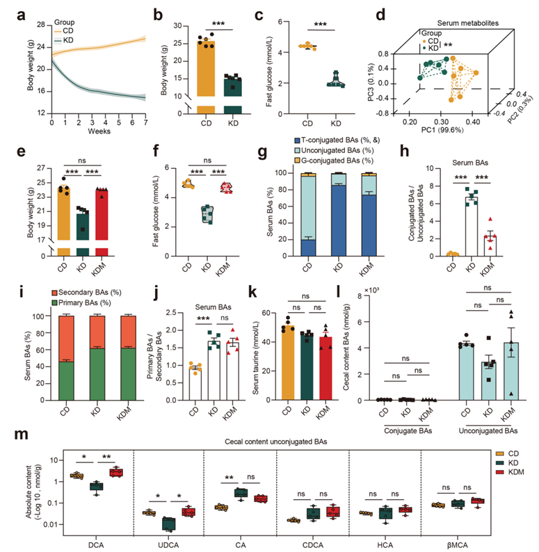 (a) 小鼠体重变化曲线。(b-c) CD或KD消耗后的体重和空腹血糖。(d) 血清代谢组主成分分析(PCA)。(e-f) 体重和空腹血糖分析。(g) 血清中BA的百分比分层。(h) 血清中共轭BAs与非共轭BA的比值。(i) 血清中原发性和继发性BA的百分比分层。(j) 血清中初级与次级BA的比率。(k) 血清游离牛磺酸水平。(l) 盲肠内容物中共轭和非共轭ba的水平。(m) 箱线图显示盲肠中6种未结合的ba含量。