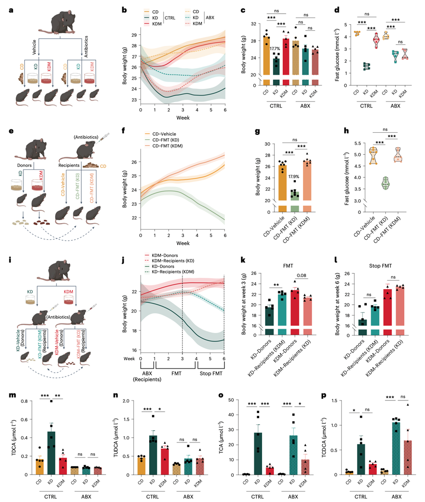 (a,e,i) ABX处理实验、FMT实验示意图。(b,f,j) 小鼠体重分析。(c-d) 饮食干预和ABX治疗后的体重和空腹血糖。(g-h) FMT后体重和空腹血糖。(k-l) FMT后体重和停止FMT后体重。(m-p) 饮食干预和ABX处理后血清TDCA、TUDCA、TCA和TCDCA水平。