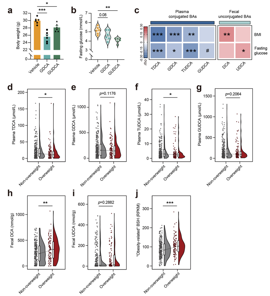 (a-b) GDCA和GUDCA处理3周后cd喂养小鼠的体重和空腹血糖。(c)相关性分析。(d-g) Raincloud图显示了超重个体和非超重个体血浆中TDCA、GDCA、TUDCA和GUDCA水平的差异。 (h-i) 柱状图显示了超重个体和非超重个体粪便中DCA和UDCA水平的差异。(j) Raincloud图显示了超重个体和非超重个体中微生物“肥胖相关”BSH基因丰度的差异。