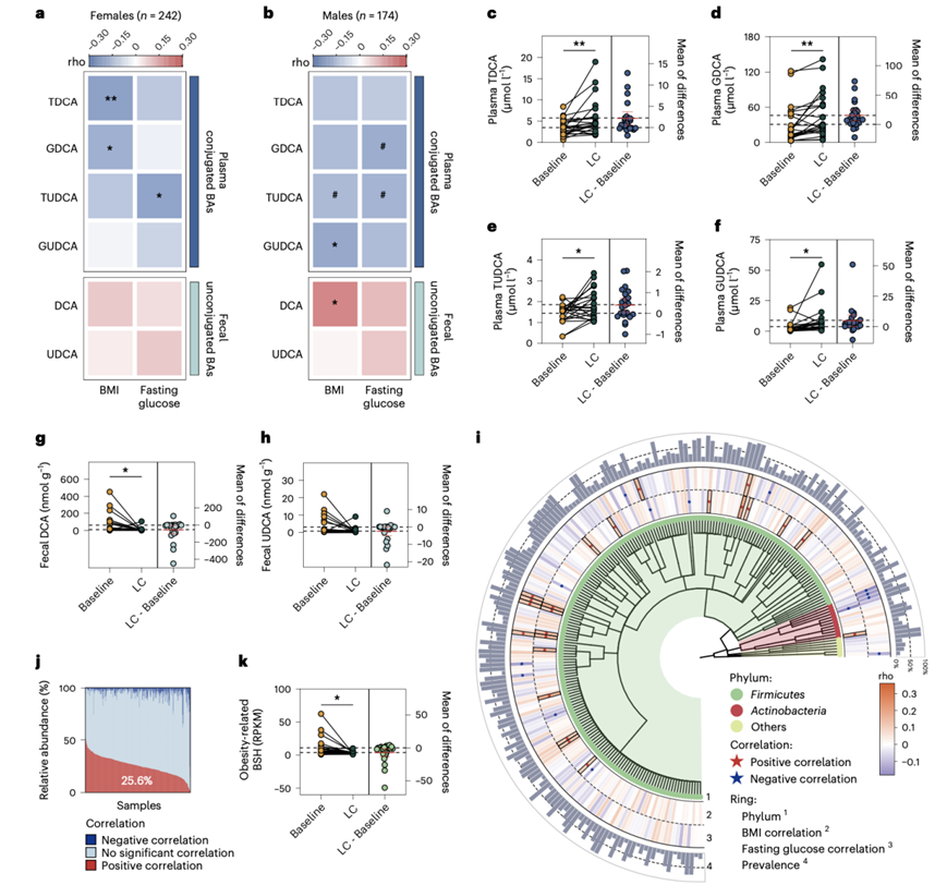 (a-b) 热图显示男性和女性血浆牛磺酸或甘氨酸共轭DCA和UDCA水平或粪便非共轭DCA和UDCA水平与BMI或空腹血糖的相关性。(c-f) 散点图和估计图显示血浆TDCA、GDCA、TUDCA和GUDCA水平的变化。(g-h) 散点图和估计图显示粪便DCA和UDCA水平的变化。(i) BSH基因丰度与BMI或空腹血糖之间关联的可视化。(j) 100%堆叠条形图显示每个样本中BSH基因的相对丰度,通过与BMI或空腹血糖的相关性分层。(k) 散点图和估计图显示了LC干预12周前后微生物“肥胖相关”BSH基因丰度的变化。