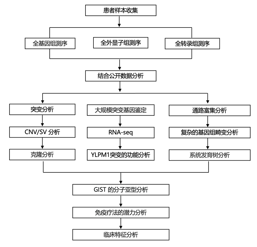 胃肠道间质瘤(GIST) 是最常见的肉瘤,通常起源于胃或小肠。大多数 GIST 是由KIT (75–80%) 或PDGFRA (5-10%)中的激活突变引起的。GIST在临床上具有异质性,在个体患者中表现出不同程度的疾病侵袭性,一些低风险病变多年保持稳定,而另一些病变则迅速发展为广泛转移性疾病。揭示导致侵袭性 GIST 发展的分子变化可能为 GIST 生物学和治疗策略提供启示。最近,已有研究利用细胞遗传学方法和全外显子组测序 (WES) 对一小部分 GIST 患者进行了研究,报告了 GIST 中DEPDC5 (17.5%)、DMD (66%)、MAX (32%)、SETD2(11.2% 的高危 GIST)和SDH (9.0%) 10的复发性体细胞变异。目前缺乏对 GIST 的系统性全基因组和转录组研究。