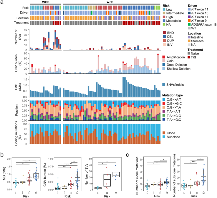 (a) 将肿瘤和正常样本配对的患者分为两组:WGS和WES,显示有关临床风险分层、KIT或PDGFRA突变外显子、原发性肿瘤部位和 TKI 治疗信息。(b) 箱线图显示交替负担随着风险分层而增加。(c) 不同风险分层中编码区内克隆(左)和亚克隆(右)突变的数量。
