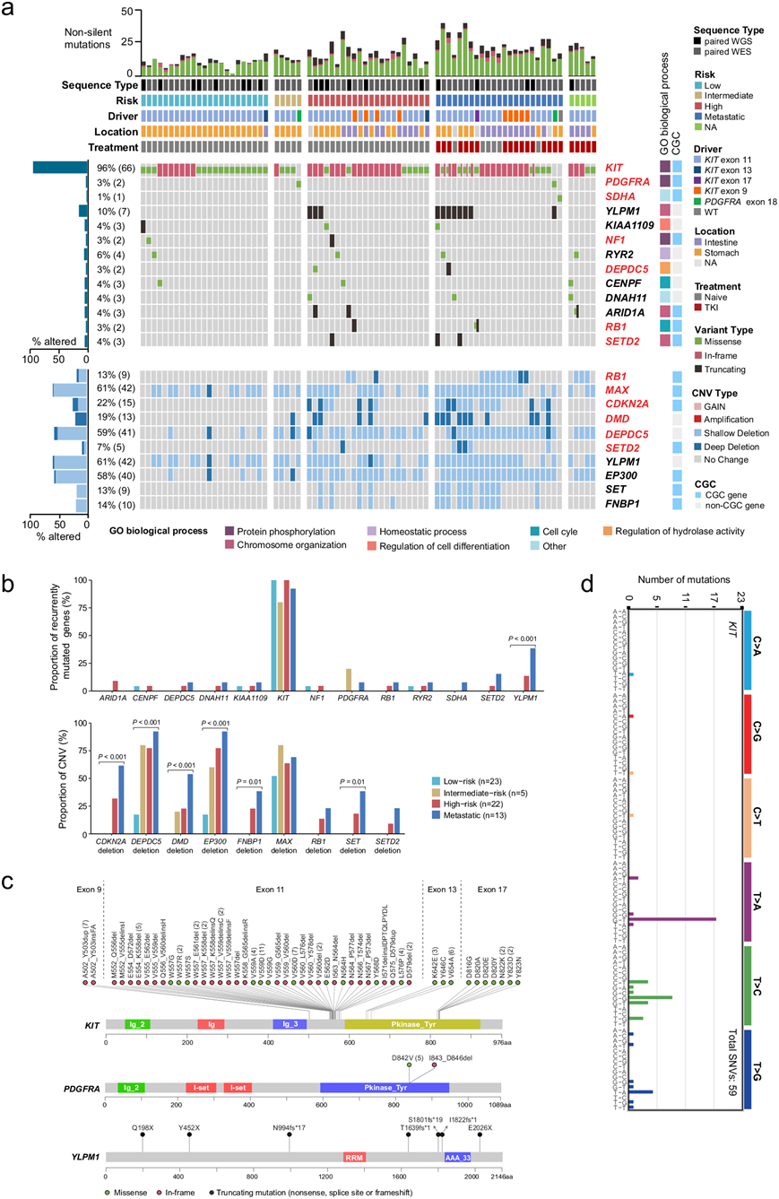 (a) 78 个 GIST 的临床和基因组改变的综合图。(b) 条形图说明不同风险下复发性突变基因和拷贝数变异的相对比例。(c) Lollipop图显示KIT、PDGFRA和YLPM1中所有非沉默突变的分布。(d) GIST中KIT突变的96突变谱。