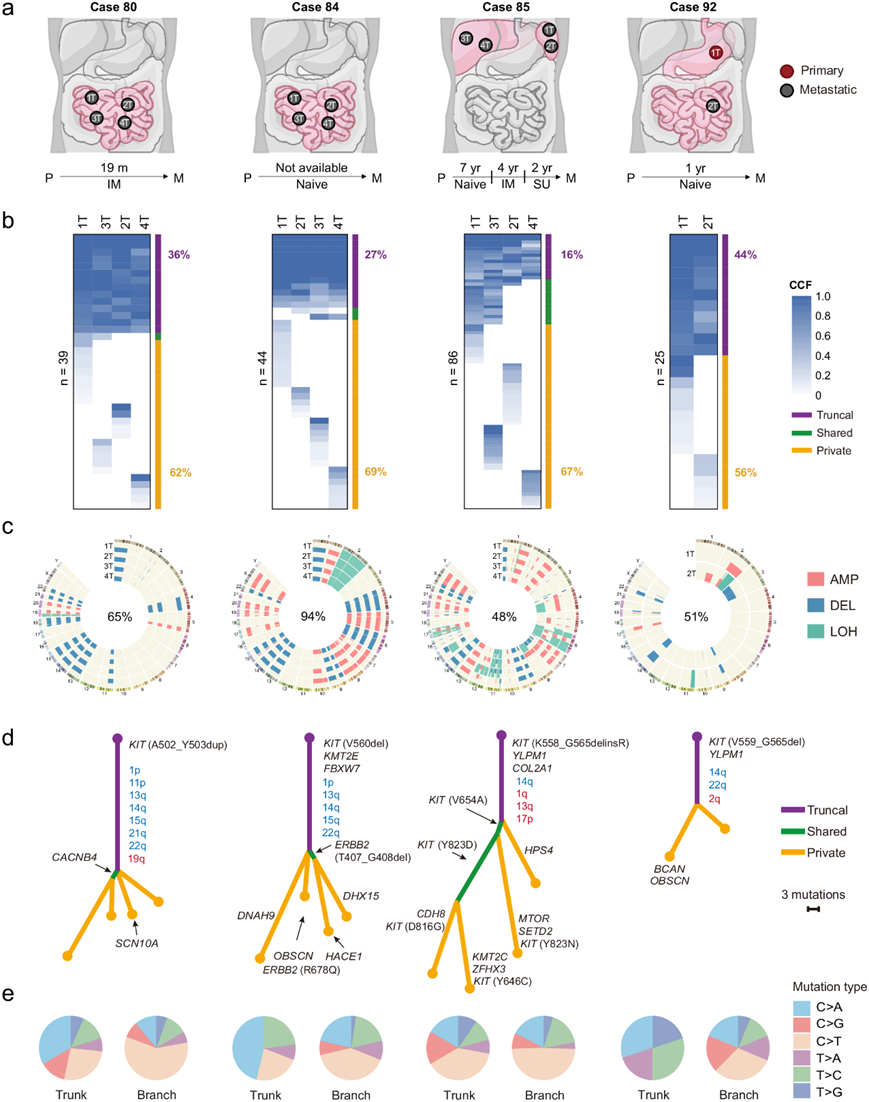 (a) 转移灶、复发时间和 TKI 靶向治疗的图表。(b) 热图显示 4 名患者每个病变中非静默突变的癌细胞分数 (CCF)。(c) 4名患者每个病变中已识别的 CNV 和拷贝中性 (CN-LOH) 区域。(d) 基于所有非静默突变的 4 名患者的系统发育树。(e) 6 个碱基突变的相对贡献。