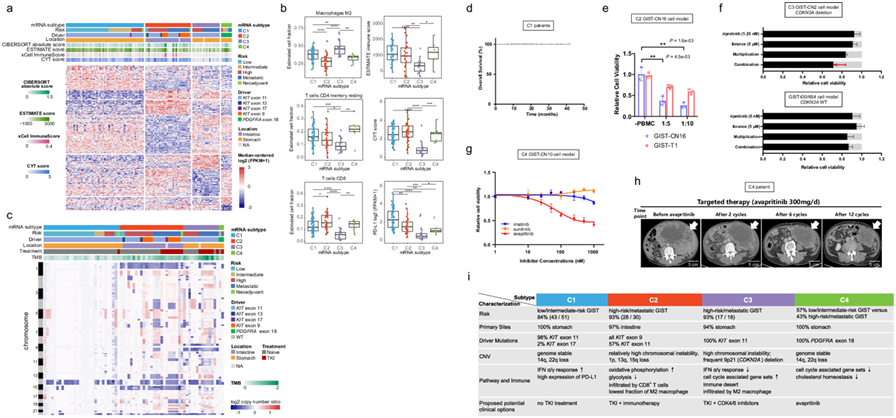 (a) 热图显示4种亚型之间的520个差异表达基因。C1、C2、C3和C4亚型的肿瘤数量分别为51、30、18和7。显示了临床风险分层、驱动突变、位置、来自CIBERSORT、ESTIMATE和xCell的免疫评分以及细胞溶解(CYT)评分。(b) 箱线图显示4种亚型之间的估计细胞分数、免疫评分、CYT评分和PD-L1表达。(c)热图显示整个基因组的拷贝数比率。(d) C1患者的总体生存率。(e) C2 亚型细胞中的T细胞介导的肿瘤细胞杀伤试验。(f) 细胞活力测定揭示了 KIT 抑制剂和 CDK4/6 抑制剂的协同作用。(g) 从 PDGFRA D842V 突变体、C4 亚型建立的 GIST-CN10 原代细胞对 avapritinib 有反应,但对伊马替尼或舒尼替尼有耐药性。(h) avapritinib 的临床数据证实了转移性 C4 亚型 GIST 患者的活动证据。(i) GIST 亚型的基因组特征、表达谱、免疫特征和潜在治疗策略。