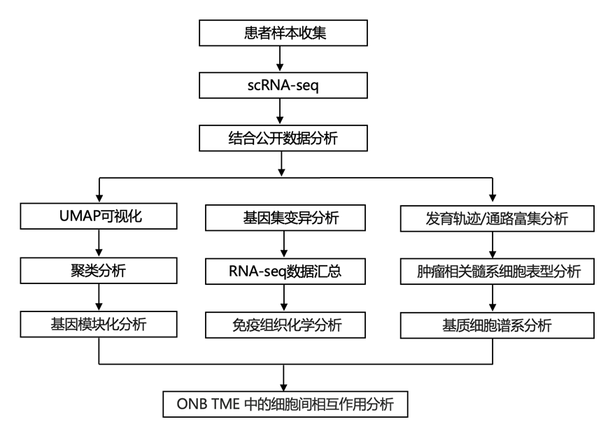 本项研究基于单细胞 RNA 谱探索了十个 ONB 肿瘤和一个嗅黏膜样本内的细胞成分,通过识别恶性上皮细胞中的五种独特表达程序展示了肿瘤内的异质性。根据不同的基因表达模式建立了 ONB 的独特三分类系统(神经、基底、间质),阐明了将大量肿瘤分类为未表征亚型的生物标志物,可以根据代表三种肿瘤类型的分子特征谨慎推断对某些化疗方案的不同反应,从而有助于精准化疗。本项研究还分析了肿瘤微环境 (TME) 的亚聚类以及 TME 内不同细胞类型之间的相互作用。免疫抑制肿瘤相关巨噬细胞的相对丰富表明针对巨噬细胞的免疫疗法具有潜在益处。