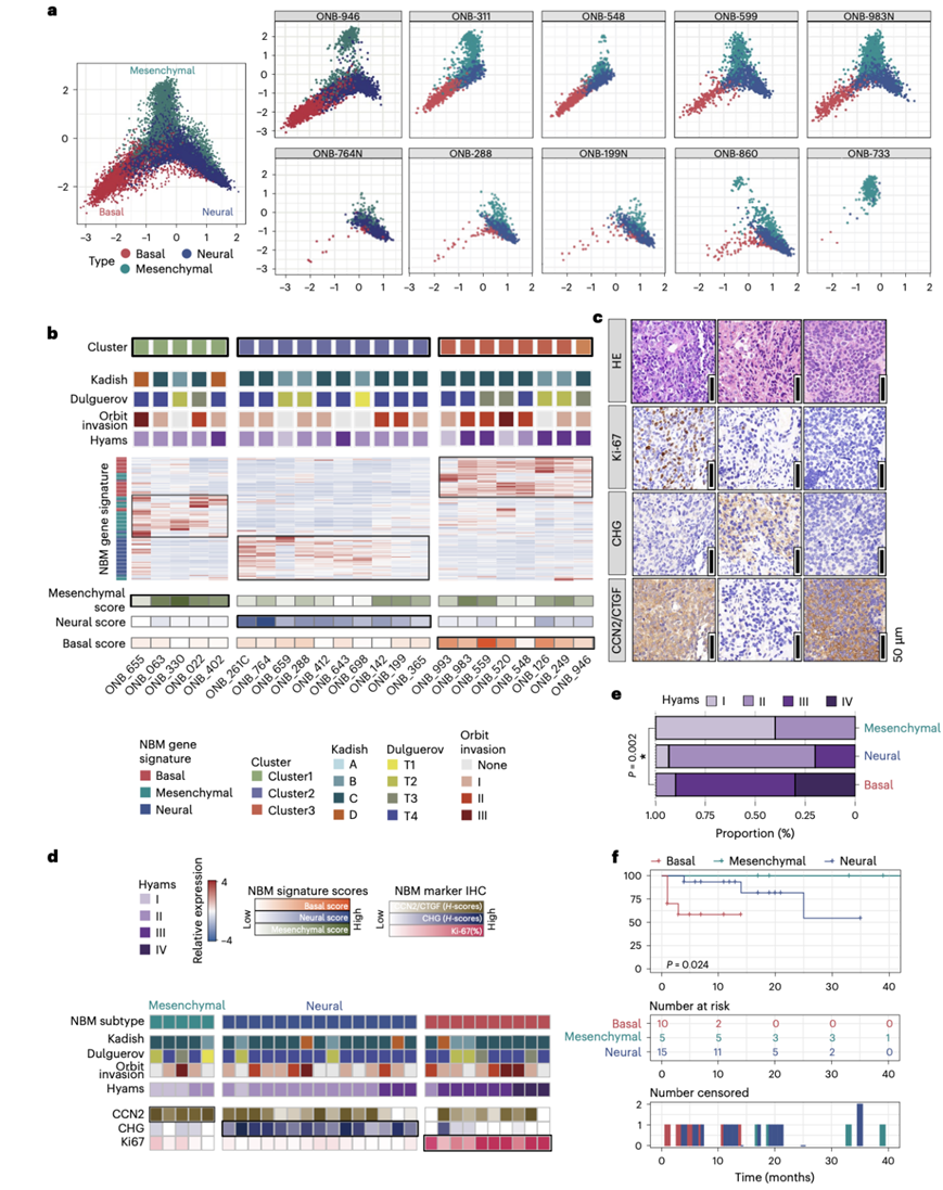 基于以上发现,并通过三个表达平台(包括 scRNA-seq、RNA-seq 和 IHC 定量分析)验证,他们建立了一个流程图,使用一种适用于临床实践的方法将 30 个 ONB 样本分为三个亚型。首先根据高 Ki-67 水平对肿瘤进行分类(如果 Ki-67 ≥ 25%,则为基底亚型),然后根据神经生物标志物 CHG 的普遍阳性表达(如果CHG 的H评分≥ 75,则为神经亚型),然后根据其仅高表达 CTGF / CCN2进行分类(如果 Ki-67 < 25%, CHG 的H评分< 75 和CTGF / CCN2的H评分 ≥ 75,则为间质亚型)。这些研究结果表明 ONB 亚型与肿瘤的分化状态之间可能存在相关性。 Hyams 分级反映间充质、神经及基底 ONB 呈依次增加的去分化趋势(图3e)。按 NBM 亚型分层的无病生存分析也显示,不同亚型 ONB 的预后结果存在统计学差异,其中间充质亚型的生存结果最为乐观(图3f)。