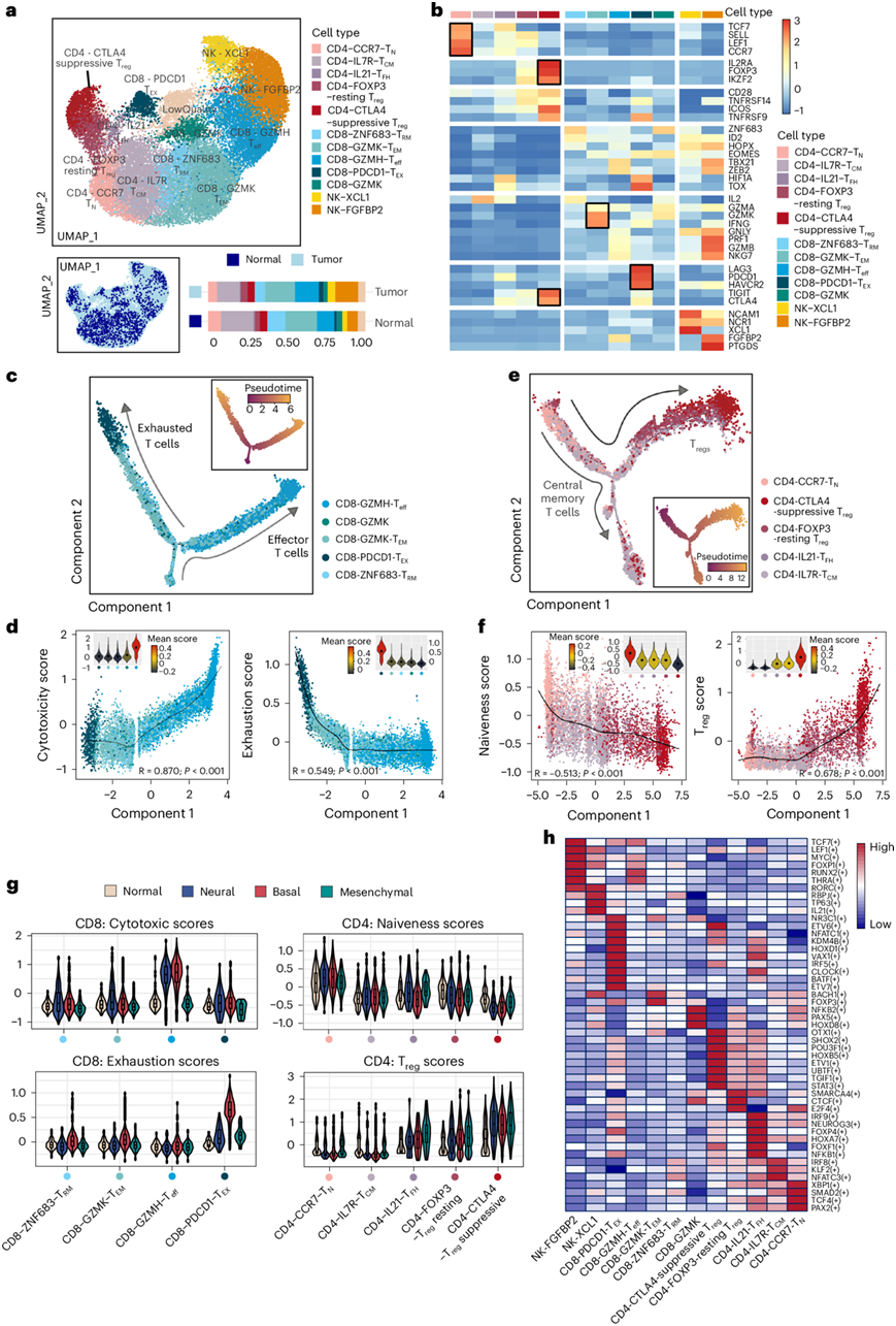 (a) UMAP可视化显示了五种CD4和五种CD8 T细胞亚型和两种NK细胞亚型的形成。(b) 每个T细胞聚类中选定功能相关基因的Z-score标准化平均表达。(c) 推断CD8+ T细胞的分化轨迹。(d) 描绘了沿Monocle2组分CD8 T细胞功能特征(耗竭和细胞毒性评分)的不同表达水平的示踪图。(e) 推断CD4+ T细胞分化轨迹。(f) CD4+ T细胞功能特征表达水平变化的示踪图。(g) 四个CD8+ T细胞亚群的衰竭评分和细胞毒性评分的分布,以及按组织来源分层的五个CD4+ T细胞亚群评分和Treg评分的分布。(h) 热图显示转录因子(TF)在每种T/NK细胞亚型中的活性。