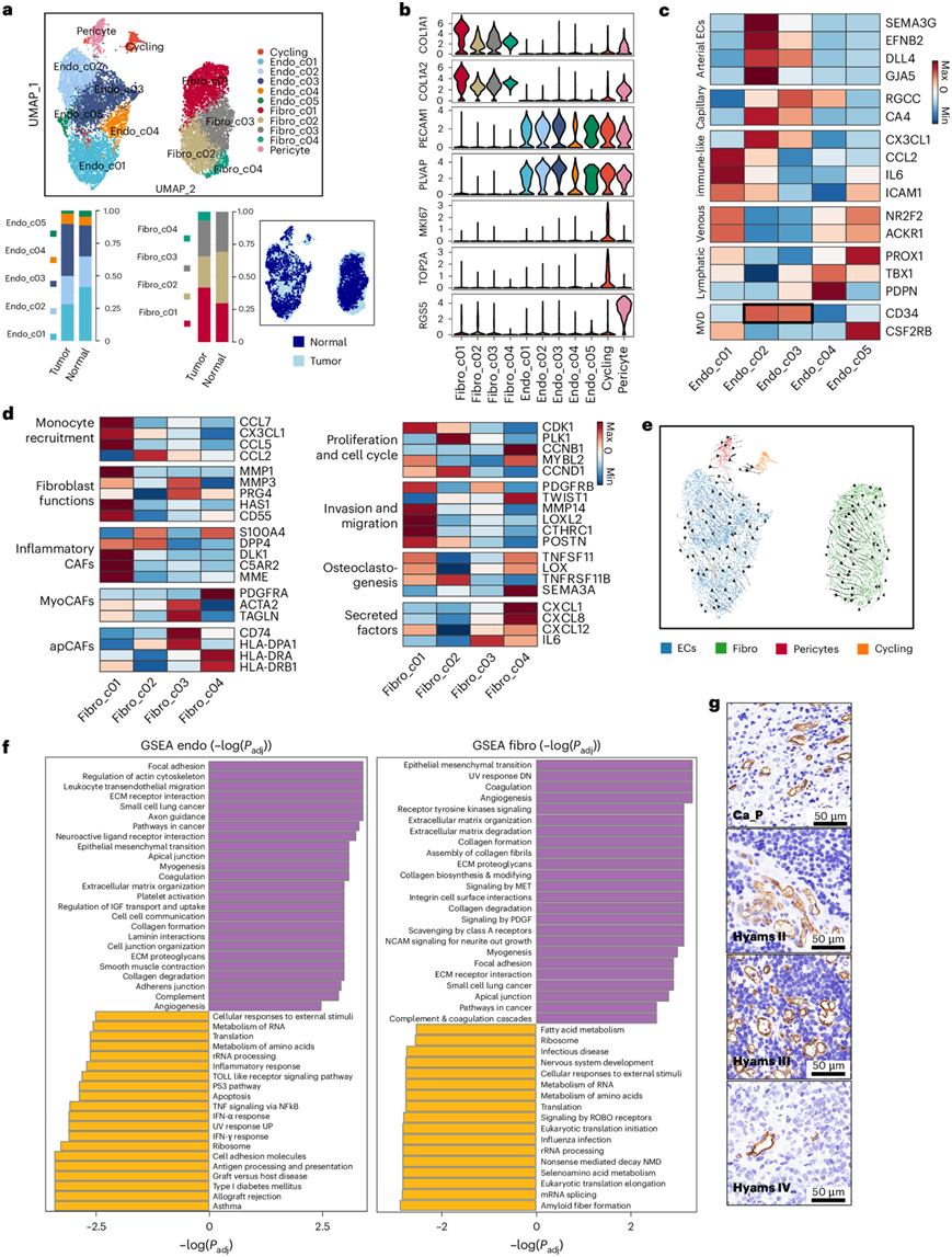 (a)UMAP可视化。(b) 小提琴图显示ONB TME基质亚群中标记基因的表达水。(c) 热图显示已知内皮细胞(EC)亚型在每个EC亚聚类中的典型标记基因表达水平。(d) 热图显示了四个成纤维细胞亚群中与典型成纤维细胞亚型和基质细胞功能相对应的基因集的表达水平。(e) ONB微环境下基质细胞的RNA速率轨迹。(f) 恶性和非恶性组织源性内皮细胞(左)和成纤维细胞(右)之间基因集富集分析的通路活性差异。(g) 不同Hyams分级的癌周黏膜和ONB肿瘤标本中CD34标记MVD的代表性免疫组化染色图像。