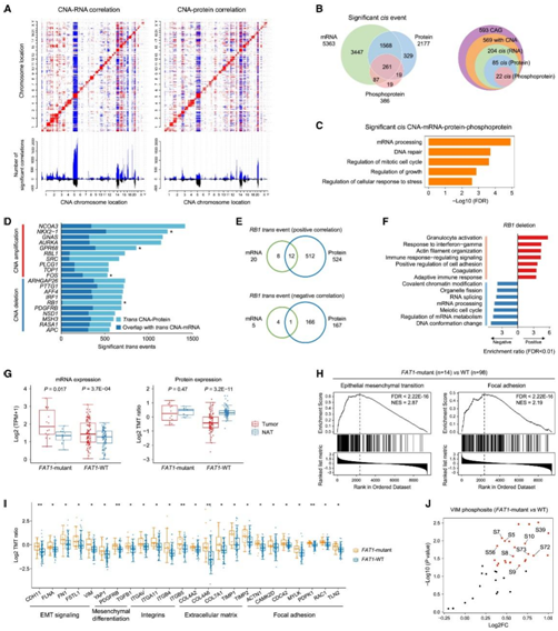 (A) CNA 与 mRNA(左)和蛋白质(右)丰度的相关性。(B) 维恩图描绘了SCNA(CAG,癌症相关基因)的顺式级联效应。(C)GO分析。(D) 条形图显示mRNA 和蛋白质水平的反式相关事件总数。(E) 维恩图,描绘了与RB1缺失具有正(上)或负(下)反式CNA-mRNA 和 CNA-蛋白质相关性的mRNA/蛋白质。(F)与RB1缺失具有正或负反式CNA 蛋白相关性的蛋白的 KEGG 通路富集。(G)分别比较FAT1突变体和FAT1 -WT组的肿瘤和NAT之间的mRNA和蛋白质丰度。(H) FAT1-突变体与FAT1 -WT 比较中上皮间质转化 (EMT) 和黏着斑途径的 GSEA 图。(I) FAT1突变体和FAT1 WT 肿瘤之间注释通路的蛋白质丰度比较。(J) FAT1-突变体和FAT1 -WT肿瘤之间VIM亚磷酸盐丰度的比较。