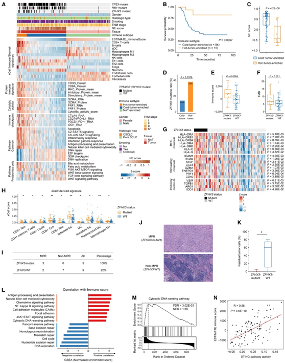 (A) 热图显示了基于 xCell 衍生细胞特征的三个免疫聚类。(B) 基于免疫亚型的总体生存 Kaplan-Meier 曲线。(C) 冷肿瘤富集亚型和热肿瘤富集亚型之间的 NE 评分比较。(D)免疫冷肿瘤和免疫热肿瘤之间ZFHX3突变率的比较。(E-F) ZFHX3-突变体和ZFHX3 -WT肿瘤之间的免疫评分和TMB的比较。(G)说明ZFHX3-突变体和ZFHX3 -WT肿瘤之间涉及MHC分子、刺激性和抑制性免疫调节剂的差异表达蛋白的热图。(H) ZFHX3-突变体和ZFHX3 -WT 肿瘤之间xCell 衍生的免疫细胞特征的比较。(I) 正在进行的临床试验中观察到的ZFHX3突变与免疫治疗反应之间的关联。(J) 具有ZFHX3突变的患者的 MPR 和接受新辅助免疫治疗联合化疗的无ZFHX3突变的患者的非 MPR 的代表性 H&E 图像。(K)来自临床试验患者的ZFHX3突变体和ZFHX3 -WT组之间残留肿瘤细胞的比较。(L) 条形图显示与免疫评分相关(红色)或反相关(蓝色)的KEGG 通路的归一化富集评分。(M) 与免疫评分相关的胞质 DNA 传感通路的 GSEA 图。(N) 散点图显免疫评分与STING 通路活性的相关性。