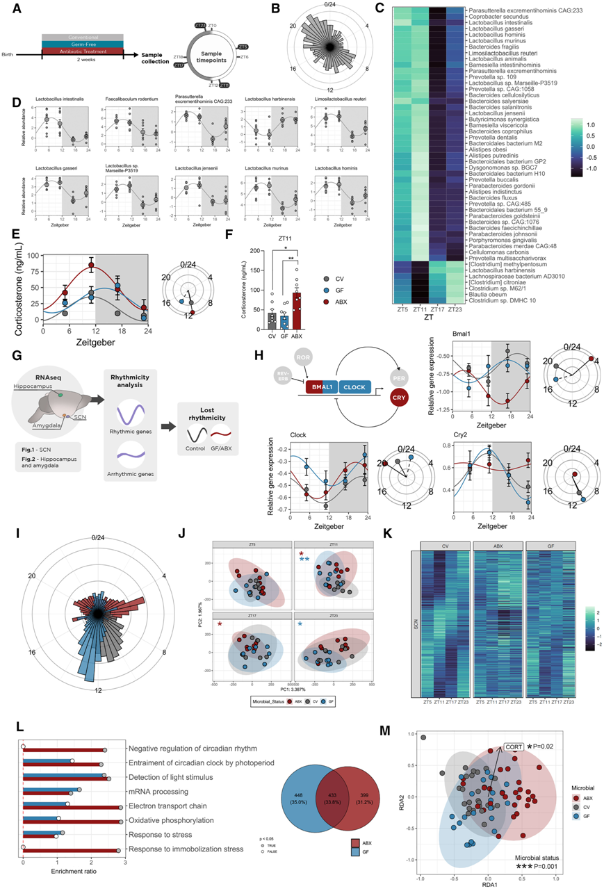 (A) 实验设计示意图。(B) 节律性分析后所有转录本的峰值期图。(C) 热图显示小鼠肠道内波动幅度最大的前50种细菌菌株。(D) 小鼠肠道中按最高振幅排序的 前10种细菌菌株。(E) 全天循环皮质酮水平。(F) ZT11 时的皮质酮水平。(G)节律性分析示意图。(H) 示意图表示核心时钟基因和蛋白质的转录-翻译反馈回路以及视交叉上核 (SCN) 中相应的改变的转录本。(I) 节律性分析后所有转录本的峰期图。(J) 在每个评估时间点对 SCN 转录组进行主成分分析。(K) GF 或 ABX 小鼠中失去节律性的 CV 小鼠的节律基因热图。(L) 失去节律性的基因的维恩图和靶向富集。(M) 对构成 Gene Ontology 中的昼夜节律通路的基因、微生物状态和皮质酮进行冗余分析的重叠图。