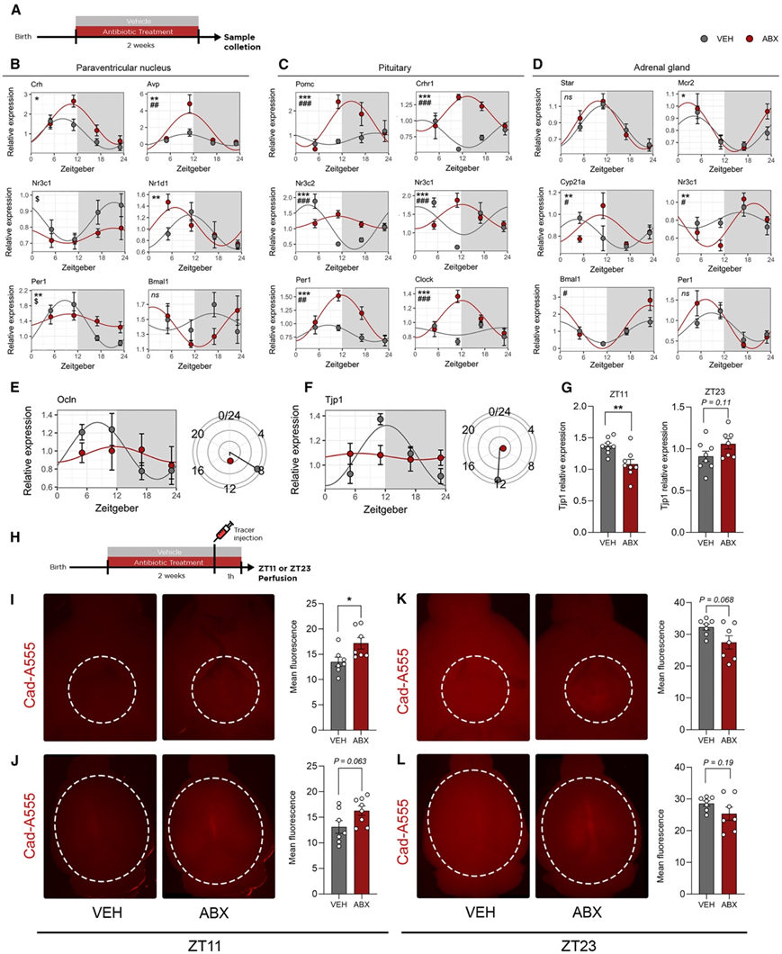血脑屏障位于大脑与循环微生物信号之间的界面。众所周知,这种屏障的功能具有昼夜节律性波动,可影响应激反应,并因慢性应激而改变。ABX 小鼠的 PVN 显示出紧密连接蛋白Ocln和Tjp1的失常表达(图 4E-F)。此外, ABX 小鼠的 ZT11 时Tjp1降低,而 ZT23 时表达呈增加趋势(图 4G)。为了确定这种改变的基因表达是否会导致血脑屏障功能的改变,他们进行了体内通透性试验(图 4 H)。在 ZT11(当Tjp1表达在 VEH 小鼠中达到峰值而 ABX 小鼠与基线相比没有变化时),他们观察到 ABX 小鼠下丘脑的通透性增加(图 4 I)。此外,皮质的通透性也有增加的趋势(图 4 J)。相反,在 ZT23,观察到 ABX 小鼠中Tjp1表达增加,下丘脑和皮质的血脑屏障通透性呈强烈下降趋势(图 4 K-L)。这些数据表明,在观察到 HPA 轴过度激活的同时,PVN 血脑屏障以一天中的时间依赖性方式对微生物信号的渗透性更强,这两者结合起来可能导致应激反应发生改变。