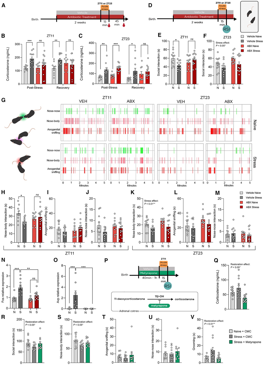 (A) 实验设计示意图。(B-C) 急性应激(15 分钟)和恢复(45 分钟)后ZT11 和ZT23 的皮质酮水平。(D) 实验设计示意图。(E) ZT11 时急性应激后的相互社交互动测试中的社交互动总时间。(F) ZT23 急性应激后,在相互社交互动测试中社交互动的总时间。(G) 评估的每种社会行为发生情况的Gantt图。(H-J) ZT11 时鼻与身体相互作用、肛门生殖器嗅探和鼻与鼻相互作用的持续时间。(I) (J) (K-M) ZT23 时鼻与身体相互作用、肛门生殖器嗅探和鼻与鼻相互作用的持续时间。(N-O) 在相互社交互动后,PVN 中Fos 和Avp的表达。(P) 实验设计示意图。(Q) 在 ZT11 接受甲吡酮治疗后,进行急性应激后的相互社会互动测试后的皮质酮水平。(R) 互社交互动测试中的社交互动总时间。(S-V) 美替拉酮给药后鼻体相互作用、肛门生殖器嗅探、鼻鼻相互作用和梳理的持续时间。
