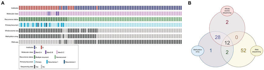 (A) Oncoprint 表示跨组学方法的样本分布。(B) 维恩图显示跨方法的组学样本分布。