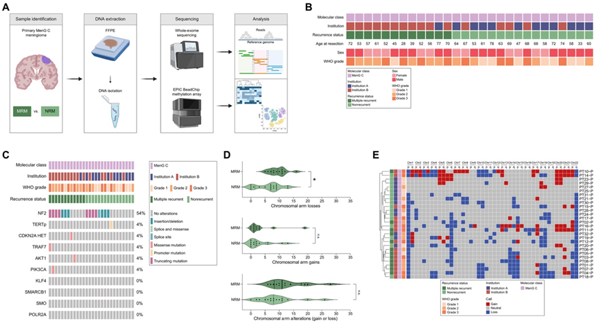 (A) 示意图表示对福尔马林固定石蜡包埋 (FFPE) 组织进行 WES 和甲基化阵列分析的 MRM 和 NRM MenG C 脑膜瘤。(B) ) MenG C 脑膜瘤样本的患者信息。(C) 来自 MRM和 NRM的 WES 的脑膜瘤文献中常见的非同义基因组变异的状态。(D) MRM和 NRM之间的臂级拷贝数差异。(E) 基于从所有 MenG C 肿瘤的 WES 计算出的染色体臂改变的无监督聚类无法分别聚类 MRM 和 NRM。
