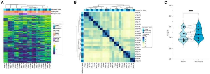图6. 匹配的原发性和复发性脑膜瘤具有相似的甲基化谱。