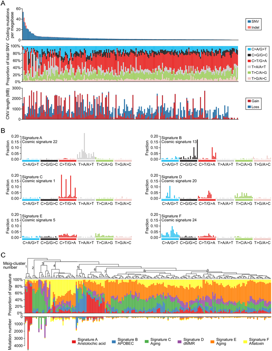他们应用 NMF 并在 204 个 ICC 样本中鉴定了六个突变特征(特征 A-F)(图 1B-C)。特征 A 以显性 T > A 突变为特征,与之前描述的特征 22高度相似,已知后者是由接触马兜铃酸引起的,并且与高突变负担相关。与此一致,特征 A 是高突变 ICC 样本中的主要特征。特征 B 以 C > G 突变为特征,与之前描述的特征 13 相似,后者是 APOBEC 驱动的高突变表型。特征 C 和 E 分别与之前描述的特征 1 和 5 高度相似,这两者都与衰老有关。特征 D 与之前描述的特征 20 相似,之前已证实该特征是由 DNA 错配修复缺陷所致,且与单核苷酸/多核苷酸重复序列中插入/缺失数量较高有关。与此一致,特征 D 主要在四种插入/缺失数量较高的 ICC 中发现。特征 F 的特征为 C > A 突变,与之前描述的特征 24 非常相似(相关相似性 = 0.94),与癌症中接触黄曲霉毒素有关。