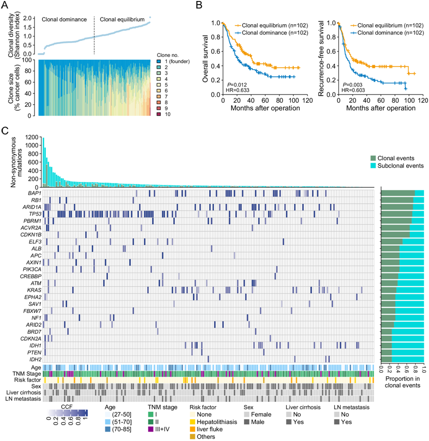 (A) 204 个 ICC 中的克隆多样性通过 Shannon 指数量化和排序。(B) Kaplan -Meier 生存分析显示基于 Shannon 指数(克隆平衡和克隆优势)的总体生存率和无复发生存率。(C) 可能的癌症驱动基因中复发性突变的演变。