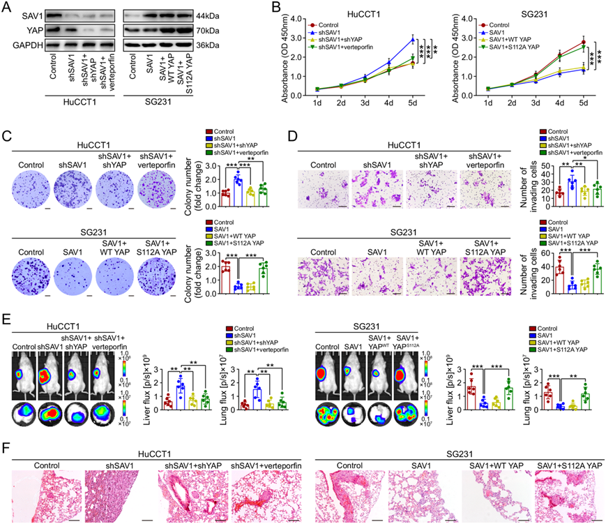 (A) 免疫印迹显示稳定转染的 ICC 细胞中 SAV1 和 YAP 的表达。(B) 与对照组相比, YAP 敲低或用verteporfin (1 μg/ml) 处理的 HuCCT1 细胞在 SAV1 敲低后增殖。(C) 与对照组相比, YAP 敲低或用维替泊芬处理的 HuCCT1 细胞在 SAV1 敲低后克隆形成活性。(D) 与对照组相比,SAV1 敲低后 YAP 敲低或verteporfin处理的 HuCCT1 细胞的侵袭活性,以及SAV1 过表达后表达野生型 YAP 或 S112A YAP 的 SG231 细胞的侵袭活性。(E-F) 小鼠 肝肿瘤和肺 转移的代表性生物发光图像,以及肺转移性结节的 H&E 染色图像。