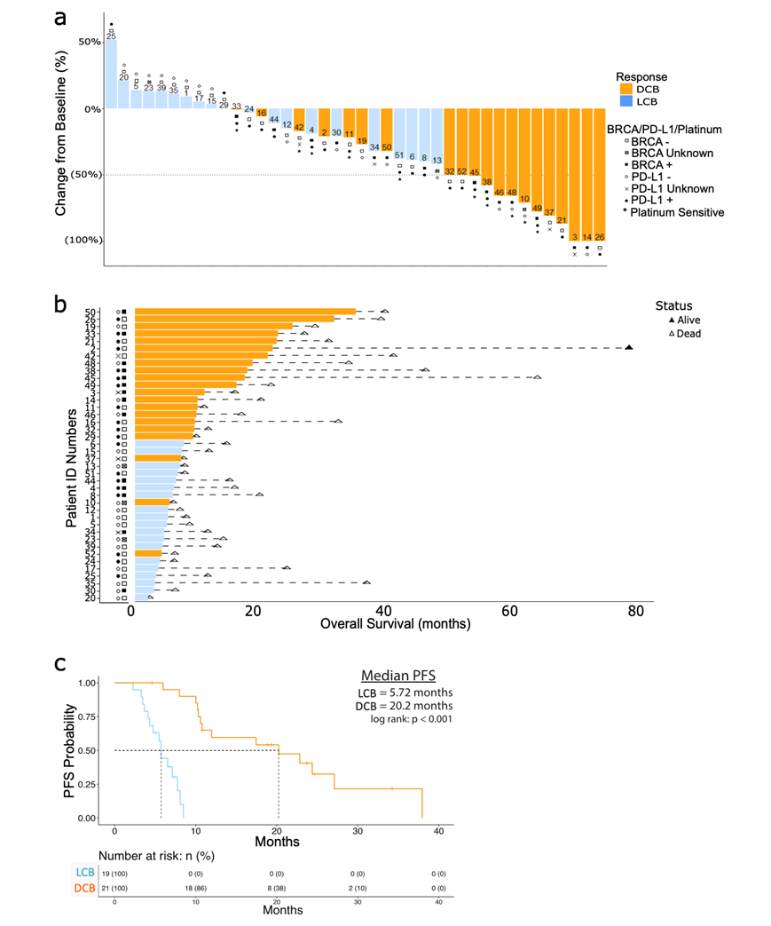 (a)瀑布图显示持久临床获益(DCB)和有限临床获益(LCB)患者人群中肿瘤大小相对于基线的变化。(b) Swimmer的图详细说明了这些患者人群的无进展生存期(PFS)差异及其BRCA1和PD-L1状态,表明仍存活的患者(黑三角)和已死亡的患者(白三角)。(c) Kaplan-Meier曲线显示DCB(橙色,中位PFS = 20.2个月)和LCB(蓝色,中位PFS = 5.72个月)人群的PFS差异。