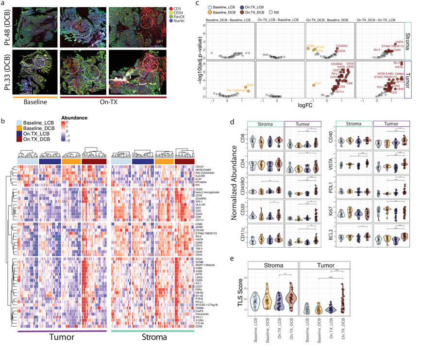 差异丰度分析显示,在 LCB 中,治疗并未引起标志物丰度或定位在肿瘤或基质区域的显著变化(图 3c-e)。相反,在 DCB 中,许多免疫标志物在治疗后升高,尤其是在确定的肿瘤区域。这些包括谱系定义标志物(CD3、CD11C、CD20),还有细胞毒性效应物(GZMB)、共刺激物(CD40、CD27)和免疫检查点(PD-L1、VISTA)蛋白。相反,DCB 中的 Ki-67 因治疗而降低。On.TX DCB 与 LCB 的比较同样揭示了增强的肿瘤和基质区室的免疫原性,表明反应与治疗诱导的免疫细胞浸润 TME 和向肿瘤区域的运输有关。在 ROI 中,CD20、CD3 和 CD11C 之间存在强相关性,表明 T、B 和树突状细胞(DC) 同时出现,分别支持 三级淋巴结构(TLS)的形成。使用这些组合标记丰度来定义 TLS 评分,发现基线和 On,TX 时 DCB 显著富集(图 3e),验证了转录组分析中 TLS 评分富集的观察结果。这些结果表明基线和 On.TX 时 DCB 和 LCB 中的免疫细胞浸润、运输和活动模式发生了改变;然而,这种差异背后的生物学病因在很大程度上尚不清楚。