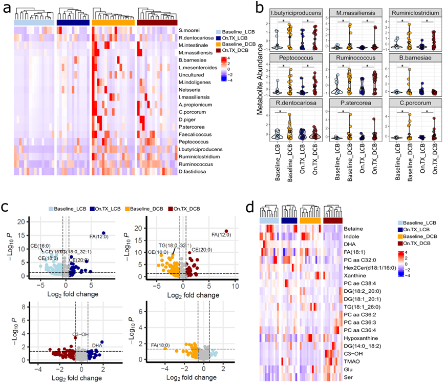 他们评估了连续收集的粪便生物样本的整体代谢,以更好地了解 DCB 和 LCB 之间不同细菌组成对功能的影响。差异代谢物分析显示,在基线和 On.TX 时,DCB 和 LCB 患者的粪便样本中存在几种特定的代谢物(图 4c-d)。许多关键代谢物与影响免疫细胞功能的途径有关,如细菌产生的代谢物[吲哚和三甲胺-N-氧化物(TMAO)、脂肪酸(FA:18:1)、酰基肉碱(C3-OH)、嘌呤生物合成(黄嘌呤、次黄嘌呤)和氨基酸(丝氨酸和谷氨酸)]。此外,DCB 患者的粪便谷氨酸水平明显高于 LCB On.TX(图 4d)。