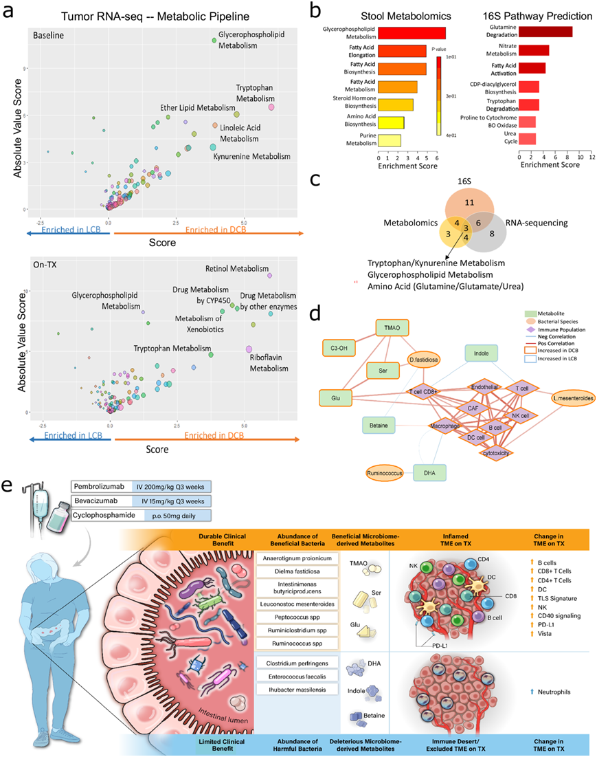 肿瘤代谢对肿瘤的生长和进展以及支持性细胞群功能至关重要。这包括基质和血管成分以及免疫细胞浸润和功能。为了在没有肿瘤代谢组学的情况下评估内在肿瘤代谢,他们使用了之前开发的生物信息学流程,根据转录组学水平数据确定 114 条代谢通路中哪条失调最严重。来自肿瘤转录组数据的代谢预测分析(图 5a)揭示了在基线和 On.TX时 DCB 和 LCB 之间严重失调的几种代谢通路,包括色氨酸代谢和犬尿氨酸代谢,以及从粪便代谢组学中观察到的几种脂质相关通路,与吲哚和磷脂酰胆碱的失调一致。为了识别连接肠道和TME的融合代谢通路,他们将来自肿瘤转录组的代谢预测与粪便代谢组学的代谢物集富集分析(MSEA)(图 5b)和16S测序的功能分类分析(Tax4Fun)(图 5b)相结合。粪便16S、粪便代谢组学和肿瘤转录组之间富集的代谢途径的重叠揭示了三条重叠途径(图 5c),包括脂质(甘油磷脂)和氨基酸相关途径(尿素/谷氨酸和色氨酸代谢)。与粪便16S类似,从基线DCB和LCB的比较中差异丰度微生物的功能富集导致尿素循环和氨基酸以及炎症功能的富集。