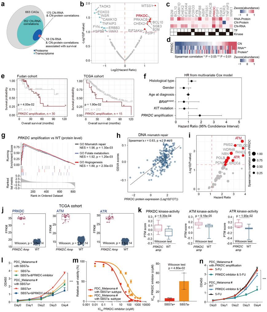 (a) 维恩图描绘了黑色素瘤中癌症相关基因 (CAG) 的 CNA 的级联效应。(b) 火山图显示了预测黑色素瘤 OS 的拷贝数变异。(c) 热图表示 18 种与生存相关的 CAG,这些 CAG 与拷贝数 (CN)、mRNA 或蛋白质显著相关。(d) 热图显示了 PRKDC 的 CN、mRNA 和蛋白质之间的相关性。(e) 生存曲线分析。(f) 森林图显示了基于本研究队列的PRKDC扩增和其他协变量的 Cox 回归风险比系数的 95% 可信区间。(g) PRKDC扩增与 WT 比较中 DNA 错配修复相关通路的 GSEA 图。(h) PRKDC蛋白表达的 Spearman 相关性和 DNA 修复过程的 GSVA 评分。(i) 火山图显示蛋白质的表达与PRKDC拷贝数相关并可预测黑色素瘤的 OS。(j) TCGA队列中携带PRKDC扩增子和 WT 样本的患者之间 ATM 和 PRKDC 的 mRNA 表达比较。(k) 激酶活性比较。(l)剂量反应曲线。(m) 细胞活力分析。(n) PDC 增殖情况分析。