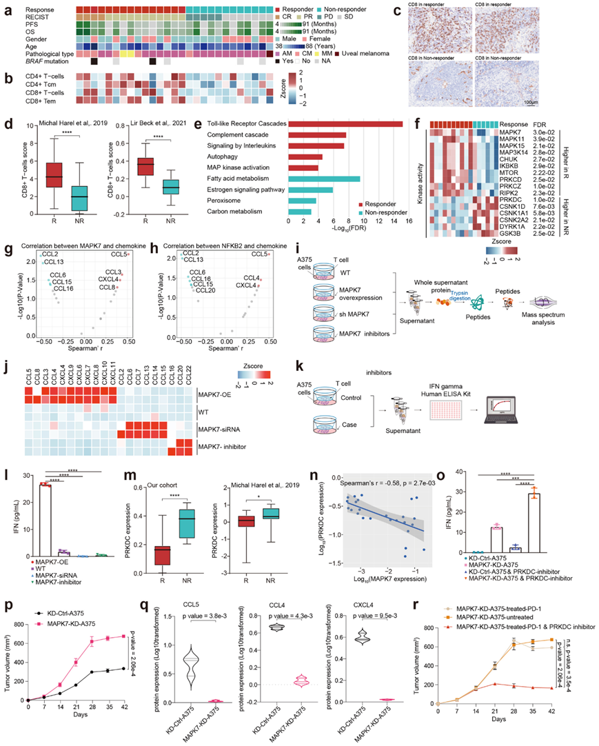(a) 热图显示了抗 PD-1 队列的临床信息。(b) 热图显示了基于使用 xCell 分析的免疫特征。(c) 免疫组织化学分析。(d) CD8+ T 细胞的 xCell 评分。(e)上调的通路分析。(f) 热图显示了应答者和无应答者中激酶活性上调的激酶。(g) 火山图显示蛋白表达与 MAPK7 激酶活性显著相关的趋化因子。(h) 火山图显示蛋白表达与 NFKB2 蛋白表达显著相关的趋化因子。(i) 实验流程。(j) 热图说明不同处理条件下 A375 细胞中趋化因子的蛋白质表达。(k) 实验流程。(l) 直方图显示不同处理条件下 A375 细胞与 T 细胞培养上清液中的 IFN 浓度。(m) PRKDC 的蛋白质表达分析。(n) 黑色素瘤中 MAPK7 蛋白表达和 PRKDC 蛋白表达的 Spearman 相关性。 (o) 直方图显示不同处理条件下 A375 细胞与 T 细胞培养上清液中的 IFN 浓度。(p) 肿瘤生长曲线。(q) 箱线图显示 KD-MAPK7-A375 肿瘤和 KD-Ctrl-A375 肿瘤之间 CCL5、CCL4 和 CXCL4 的蛋白质表达。(r) 肿瘤生长曲线。