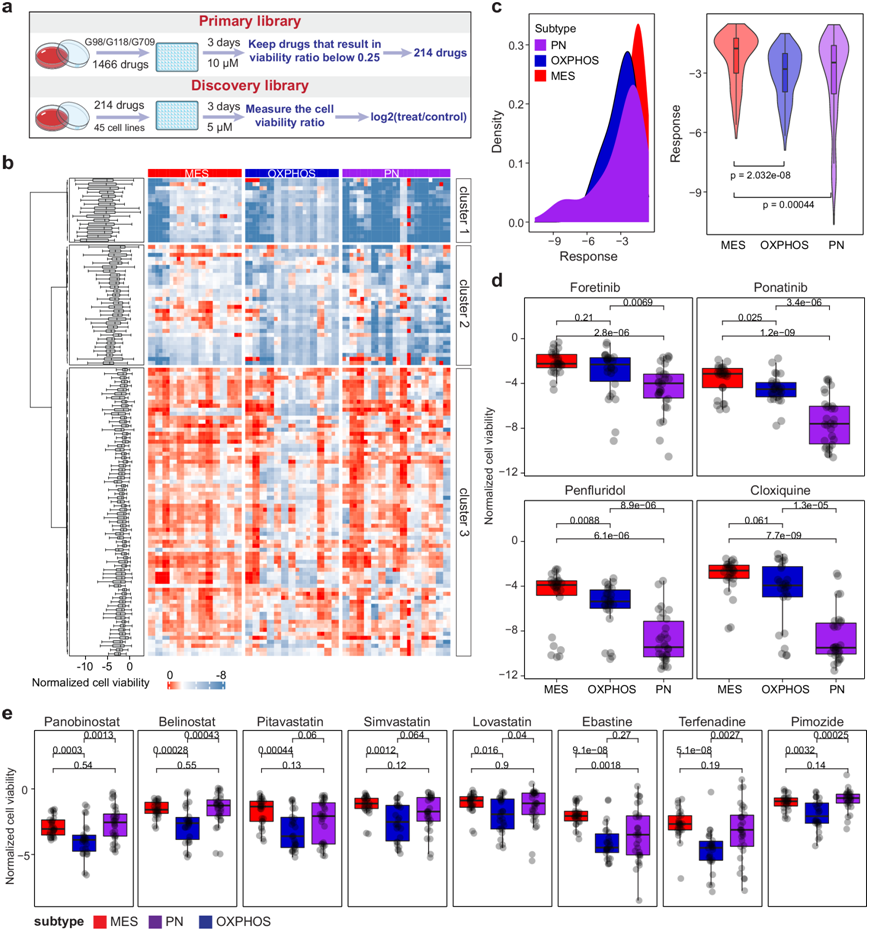 细胞活力分析表明,PDGC 对药物的反应是可变的。他们发现 96 种药物对任何 PDGC 均没有产生抑制作用,因此他们保留了剩余的 118 种药物进行进一步分析(图 4b)。总体而言,与 PN 和 OXPHOS 亚型的 PDGC 相比,MES 亚型的 PDGC 对药物的抵抗力更强(图 4c)。