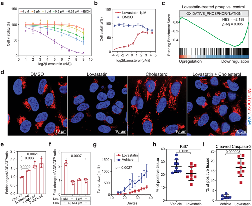 他们发现在洛伐他汀处理的BIN423细胞中补充胆固醇(或其前体羊毛甾醇)可消除洛伐他汀的抑制作用(图 5a-b),这表明洛伐他汀通过降低胆固醇水平来抑制OXPHOS亚型PDGC的生长。