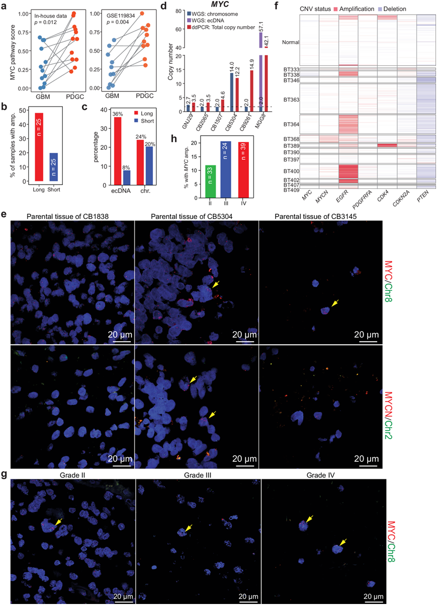 (a) PDGC 和匹配的 GBM 组织中的 MYC 通路表达评分。(b) 具有MYC/MYCN扩增的样本百分比 。(c) 具有MYC/MYCN DNA 扩增或MYC/MYCN ecDNA 扩增的样本百分比。(d) MYC的拷贝数。(e) 代表性FISH图像显示患者 CB1838、CB5304 和 CB3145 的原发性 GBM 组织中的MYC/MYCN扩增。(f) 热图显示指示基因的 CNV。(g) 代表性 FISH 图像显示II、III 和 IV 级胶质瘤组织中罕见的MYC扩增肿瘤细胞。(h) II 级、III 级和 IV 级胶质瘤组织中含有三个以上MYC扩增细胞的样本百分比 。