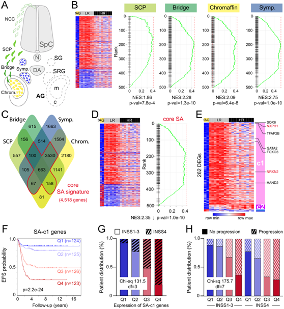 (A) 交感肾上腺 (SA) 谱系的示意图。(B) 对 HR vs LR DEG 列表中的人类 SCP、桥细胞、嗜铬细胞和交感细胞的特征进行基因集富集分析 (GSEA)。 (C) 维恩图显示了人类 SCP、桥细胞、嗜铬细胞和交感母细胞特征的重叠,突出了核心 SA 特征。 (D-E) DEG分析。(F) 无事件生存(EFS)分析。(G) 基于 INSS 肿瘤分期(1-3 期或 4 期)的 SA-c1 四分位数分布。 (H) 8 个 SEQC 亚组(INSS1-3 或 INSS4 的四分位数 Q1-Q4)根据疾病进展的分布。