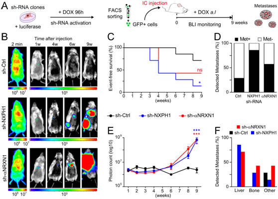 (A) 用于评估 NXPH1/α-NRXN1 抑制对体内 NB 转移定植的影响的实验设计。 (B) 体内荧光素酶衍生生物发光的代表性图像。 (C) 小鼠的EFS 分析。(D) 转移瘤分析。(E) 总光子计数。(F) 在肝脏、腿骨或其他部位检测到转移瘤。