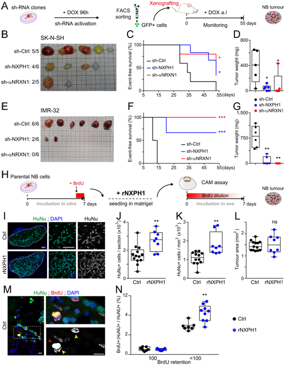 (A) 用于评估 NXPH1/αNRXN1 抑制对体内 NB 生长的影响的实验设计。(B-G) 肿瘤形成分析、生存分析。(H) 用于在 CAM 测定中评估人重组 NXPH1 (rNXPH1) 对 NB 细胞生长的影响的实验方案。 (I-N)免疫荧光和细胞量化。
