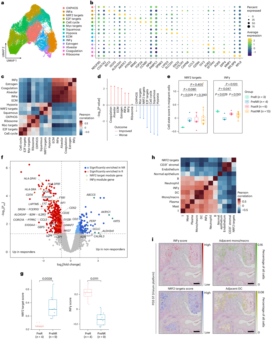 (a) UMAP 图显示按癌细胞状态着色的癌细胞。(b) 点图显示每种癌细胞状态的代表性标志物的平均表达量和表达百分比。(c) 癌细胞状态评分的Pearson相关性。(d) Lollipop图显示 将癌细胞状态与 TCGA-LUAD 队列患者临床结果联系起来的 Cox 回归分析的P值。(e) 箱线图显示治疗期间应答者和无应答者的恶性细胞中 NRF2 靶标(左)和 IFNγ(右)的细胞状态评分。(f) 火山图比较应答者和无应答者的调整后P 值和肿瘤 ROI 之间的差异倍数。(g) 使用 DSP 数据显示应答者和无应答者的肿瘤 ROI 中 NRF2 靶标(左)和 IFNγ(右)的细胞状态评分的箱线图。(h) Visium 载玻片中所有恶性斑点的细胞状态评分(针对 NRF2 靶标、IFNγ 和相邻细胞类型)的 Pearson 相关性。(i) P03 的 TME中IFNγ 评分、NRF2 靶标评分和相邻单核细胞/巨噬细胞和树突状细胞的丰度的空间分布。