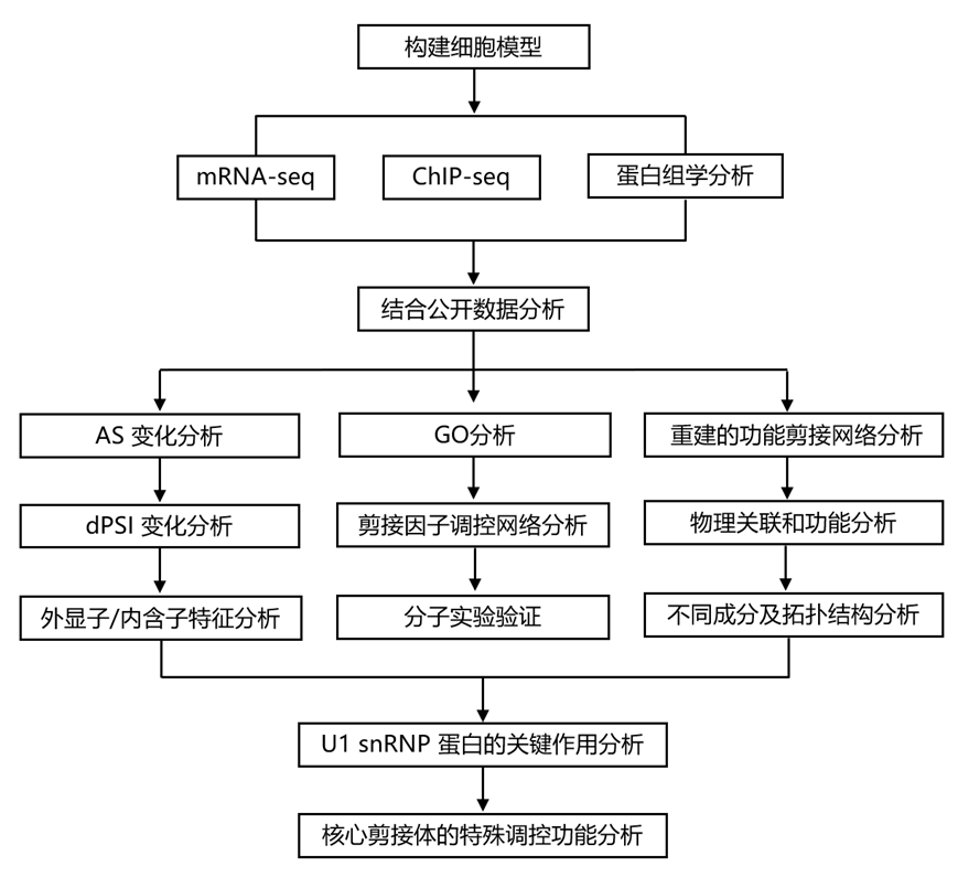本研究报告了对人类癌细胞中 305 个剪接体成分和调节因子进行系统敲除的转录组分析数据,以及重建控制不同类型可变剪接决策的功能性剪接因子网络,分析了剪接因子交叉调节的复杂回路,揭示了后期组装的 U4/U6.U5 snRNP 复合物的精确结构调节剪接位点配对,并发现 U1 snRNP 的蛋白质成分在调节外显子定义和Alt5′ss选择方面存在前所未有的分工特征。因此,本研究为探索剪接调节的生理和病理机制提供了新的理论依据。