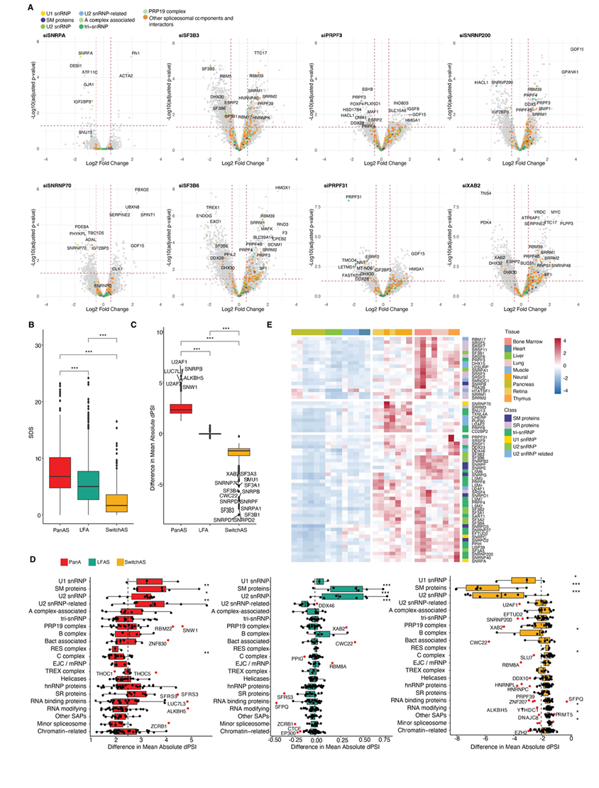 (B) 箱线图显示了三组不同AS事件类型中SF的KD诱导的剪接变化幅度。(C) 箱形图显示了PanAS、LFA和SwitchAS的平均绝对dPSI相对于所有事件的dPSI的差异。(D) 箱形图显示了各种剪接复合物和相关蛋白的平均绝对dPSI的差异。(E) 不同组织类型中sf相对mRNA表达水平的无监督聚类热图。