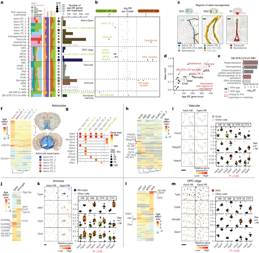 (a) 按细胞类别分组,每种非神经元超类型以及两个 IMN 亚类的年龄-DEG数量汇总。(b) 每个聚类的老年细胞与成年细胞成员数与相应类别的老年细胞与成年细胞成员总数的 log2 OR 之比。(c) 从 ABC-WMB图谱 MERFISH 数据中获取的已知和/或疑似成年神经发生区域的空间定位。(d) 每种非神经元超类型和 IMN 亚类的年龄相关DEG数量与 Augur AUC 评分之间的关系。(e)GO分析。(f,h,j,l) 所有年龄相关DEG的年龄效应大小热图。(g,I,k,m) 所有聚类的标记基因的点图和箱线图。