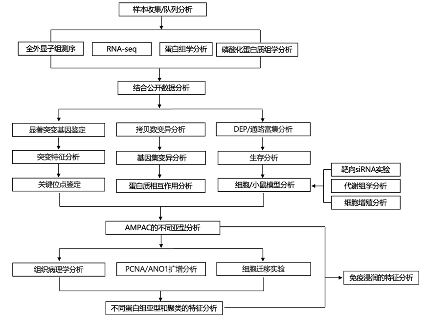 本研究对来自中国 AMPAC 患者和十二指肠患者的 198 个样本进行了全面的多组学分析。基因组数据表明 4q 缺失会导致脂肪酸积累和细胞增殖。蛋白质组学分析揭示了三个不同的聚类(C-FAM、C-AD、C-CC),其中最具侵袭性的聚类C-AD 与最差的预后相关,并以粘着斑为特征。免疫聚类确定了三个免疫聚类,并揭示了免疫聚类 M1 (巨噬细胞浸润聚类)和 M3(DC 细胞浸润聚类)与M2(CD4+ T 细胞浸润聚类)相比表现出更高的免疫评分,由于肿瘤细胞可能分泌 IL-6 及其后续影响,与不良预后相关。本研究提供了全面的蛋白质组学分析,以寻求更好地了解和潜在的 AMPAC 治疗方法。