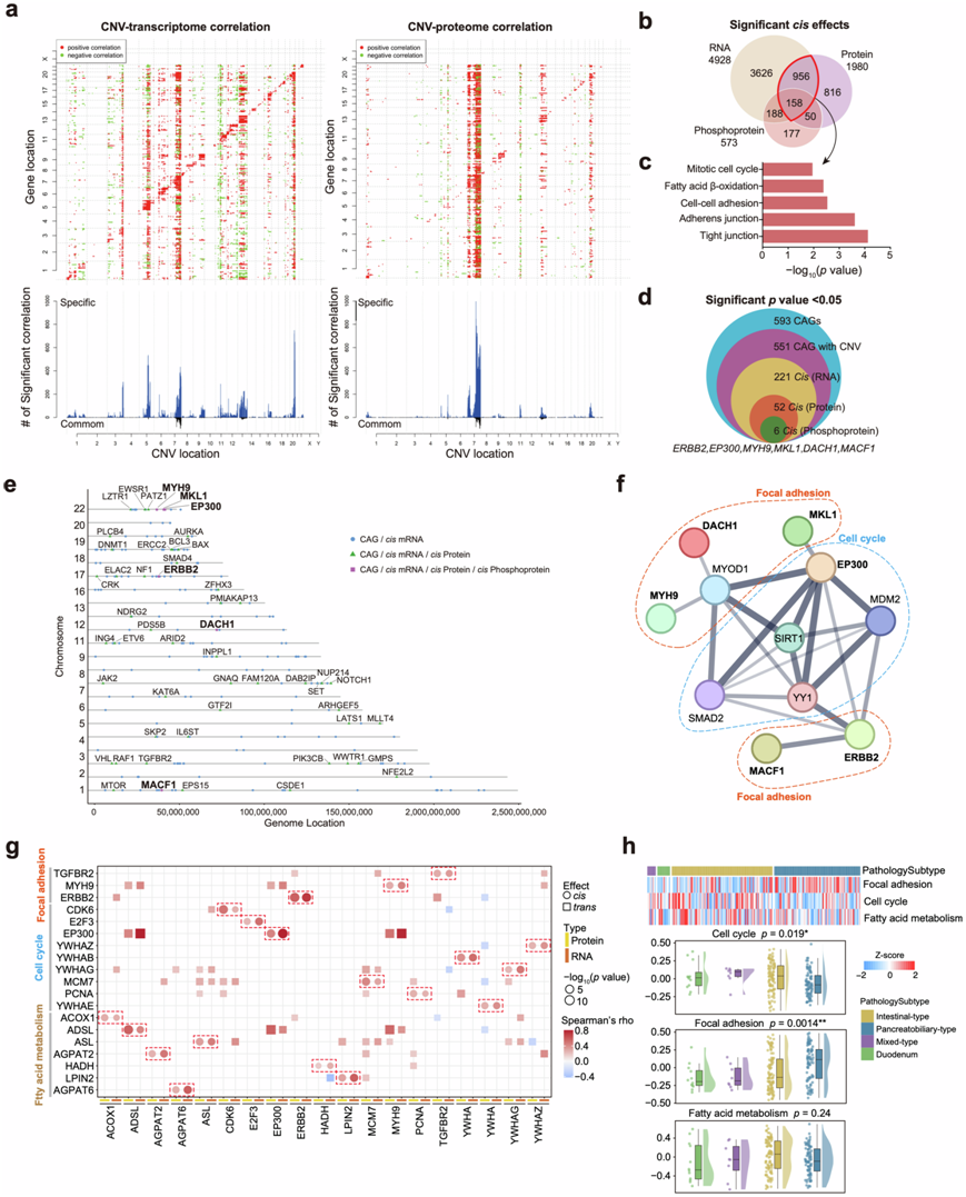 (a) CNV 对 mRNA 和蛋白质的功能性影响。(b) 维恩图通过转录组、蛋白质组和磷酸化蛋白质组分析描绘了 CNV 的级联效应和顺式事件之间的重叠。(c) 1114个显著顺式效应基因富集的通路与转录组和蛋白质组重叠。(d) 通过多组学数据分析显示具有显著 CNV顺式效应的 CAG 的维恩图。(e) 具有级联拷贝数顺式调控其同源 mRNA、蛋白质和磷蛋白水平的 CAG 的位置。(f) 由6 种 CAG 构建的蛋白质-蛋白质相互作用网络。(g) 来自粘着斑、细胞周期和脂肪酸代谢途径的显著顺式效应基因的顺式和反式效应。(h) 不同病理亚型中粘着斑、细胞周期和脂肪酸代谢通路的 GSVA 评分的热图和箱线图。