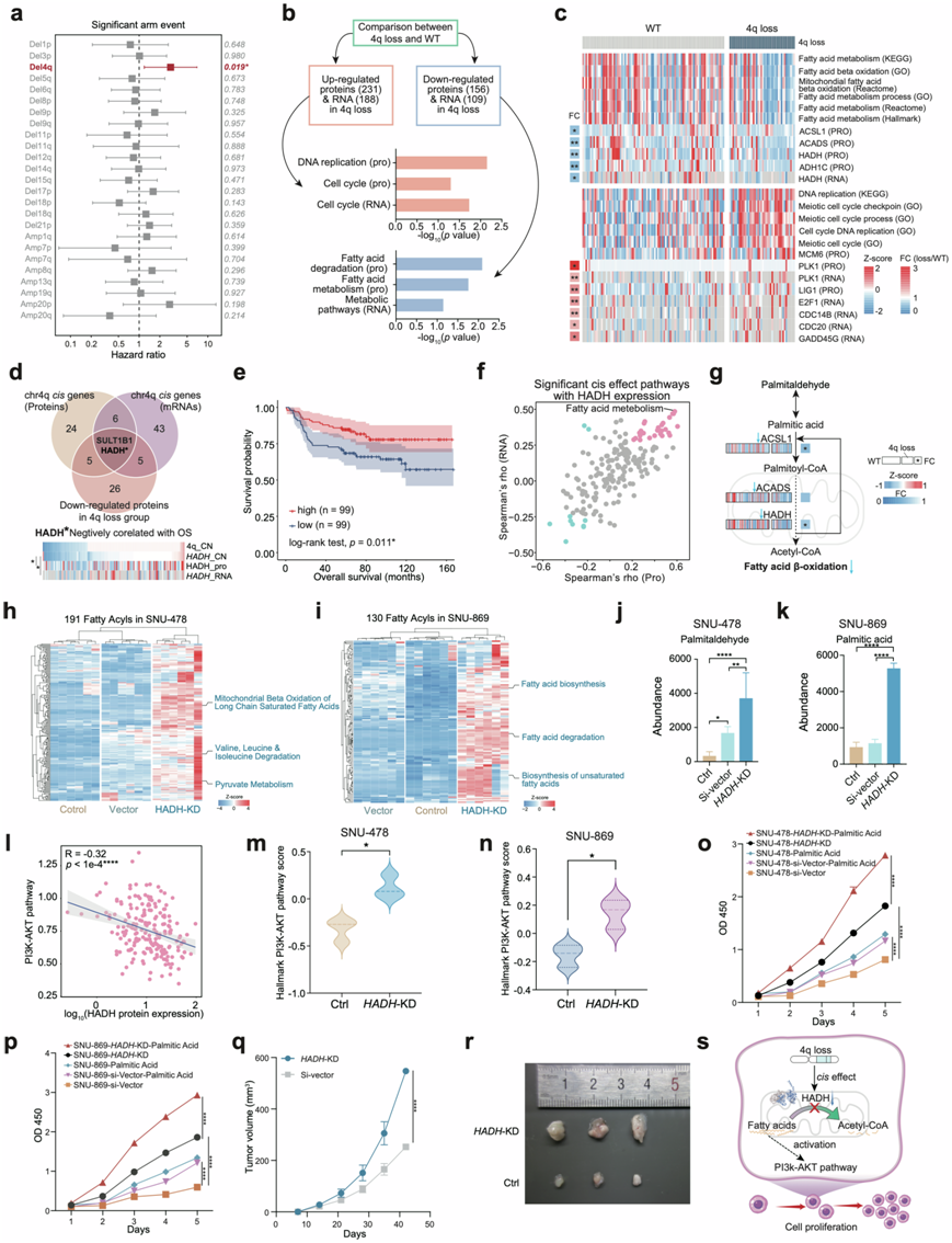 (a) 森林图显示显著臂事件的风险比。(b) 4q缺失组与 WT 组的比较。(c) 差异表达基因富集的通路的 GSVA 评分热图。(d)上:根据 4q 缺失组与 WT 组的表达水平选择 4q 上的候选顺式基因并与总体生存率相关。下:热图显示 HADH 拷贝数、蛋白质表达和 mRNA 丰度。(e) 基于 HADH 蛋白表达的总生存率的 Kaplan-Meier 曲线。(f) 散点图显示 KEGG 通路的 GSVA 评分与 HADH 在蛋白质和 mRNA 水平上的表达之间的相关性。(g) AMPAC中脂肪酸代谢通路 4q 缺失组与 WT 组比较示意图。(h) SNU-478 细胞中基于 MS 的 191 种脂肪酰基的热图以及 191 种代谢物的通路富集情况。(i) 基于 MS 的 SNU-869 细胞中 130 种脂肪酰基的热图和这 130 种代谢物的通路富集情况。(j) 条形图根据基于 MS 的非靶向代谢组学结果显示了 SNU-478 中对照组、空载体组和 HADH-KD 组中棕榈醛(palmitaldehyde)的丰度。(k) 棕榈酸(palmitic acid)的丰度分析。(l) 散点图描述了 HADH 蛋白表达与 PI3K-AKT 通路的 GSVA 评分之间的相关性。(m) SNU-478对照组和HADH-KD组的Hallmark PI3K-AKT通路GSVA评分的小提琴图。(n) SNU-869对照组和HADH-KD组的Hallmark PI3K-AKT通路GSVA评分的小提琴图。(o-p)细胞增殖分析。(q) 异种移植肿瘤体积分析。(r) 注射到裸鼠皮下后的 SNU-478 细胞异种移植肿瘤图像。(s) 系统图总结了由于 4q 缺失导致的脂肪酸代谢失调促进细胞增殖的影响。