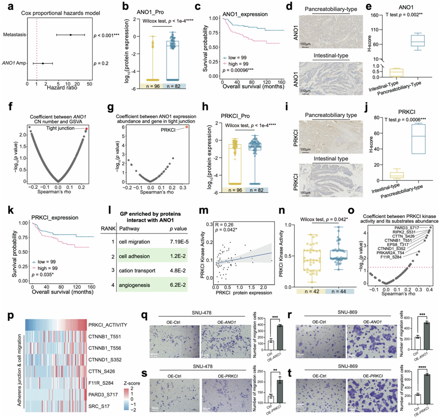 (a) 风险比分析。(b) 肠型 (左:黄色)和胰胆型(右:蓝色)中的ANO1扩增状态。(c)生存分析。(d-e) 肠型和胰胆型样本中 ANO1 IHC 图像和H 分数。 (f) ANO1 蛋白丰度与 GSVA 评分的Spearman相关性。(g) 紧密连接途径中 ANO1 蛋白丰度和基因的 Spearman 相关性。(h) 箱线图显示肠型(黄色)和胰胆型(蓝色)中的 PRKCI 蛋白表达。(i) IHC染色显示与肠型样本相比,PRKCI 在胰胆型样本中高度表达。(j)箱线图显示肠型和胰胆型样本中 PRKCI IHC 图像的 H 分数。(k)生存分析。(l) 蛋白质富集通路与 ANO1 相互作用。(m) PRKCI 蛋白丰度与 PRKCI 激酶活性的 Spearman 相关性。(n) 箱线图显示肠型(黄色)和胰胆型(蓝色)之间的 PRKCI 激酶活性。(o) PRKCI 激酶活性与 PRKCI 底物的 Spearman 相关性。(p) 热图显示 PRKCI 激酶活性与 PRKCI 底物的丰度。(q-t) Transwell实验。