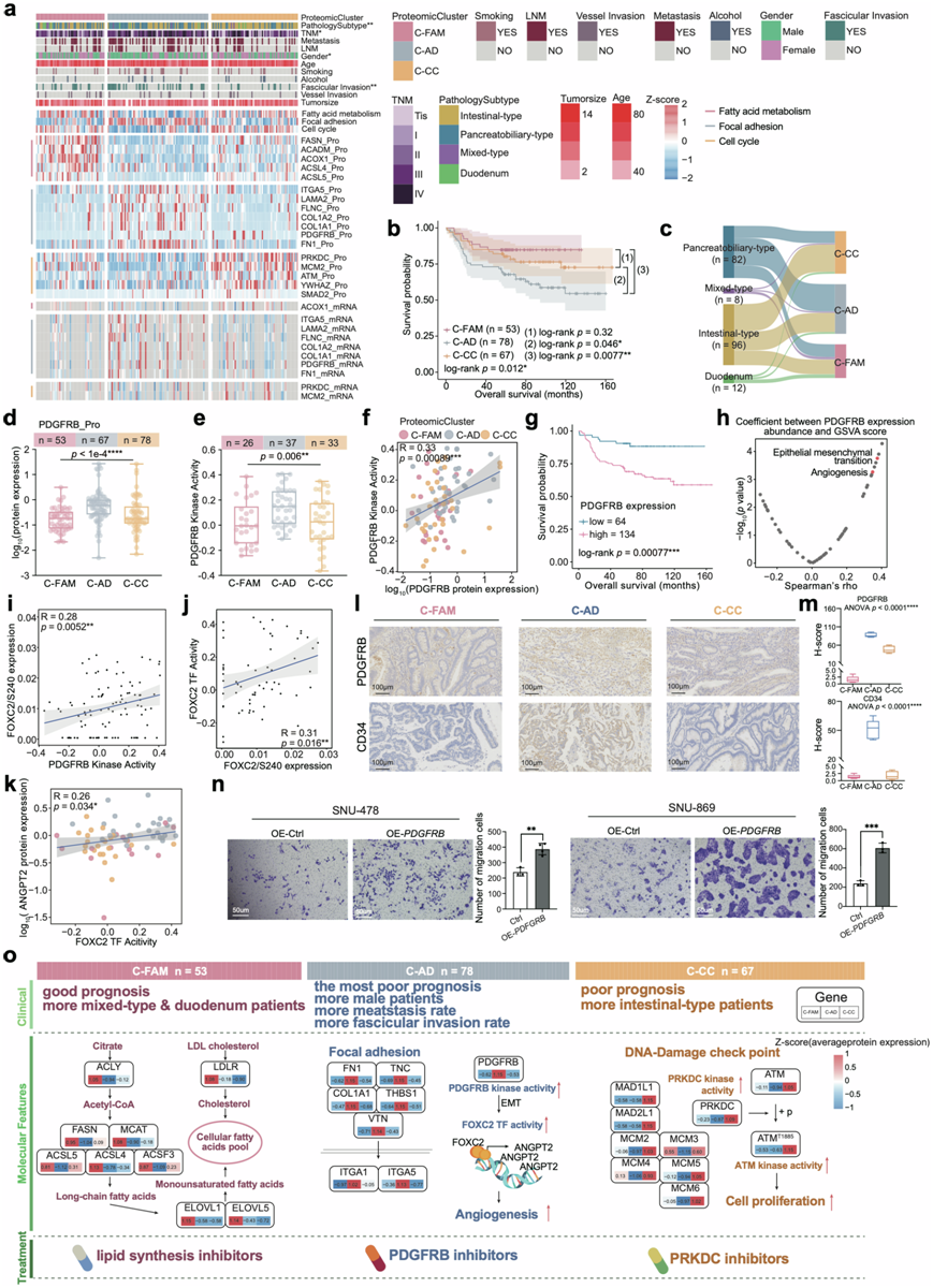 (a) 热图显示了三个蛋白质组聚类的特征。(b) 基于蛋白质组聚类的总体生存率的 Kaplan-Meier 曲线。(c) 桑基图揭示了蛋白质组聚类和病理亚型之间的关联。(d) PDGFRB 蛋白表达分析。(f) PDGFRB 蛋白表达与 PDGFRB 激酶活性的 Spearman 相关性。(g) 基于PDGFRB 蛋白表达的总体生存率的 Kaplan-Meier 曲线。(h) 散点图描述了 PDGFRB 蛋白表达与 GSVA 评分之间的相关性。(i) PDGFRB 激酶活性与 FOXC2/S240 丰度的 Spearman 相关性。(j) FOXC2 /S240 表达与 FOXC2 TF 活性的 Spearman 相关性。(k) FOXC2 TF 活性与 ANGPT2 蛋白表达的 Spearman 相关性。(l) IHC染色分析。(m) 箱线图显示蛋白质组聚类中 PDGFRB IHC 图像的 H 分数。(n) Transwell 分析表明,与对照组相比,SNU-478-PDGFRB-OE 组细胞和 SNU-869-PDGFRB-OE 组细胞具有更高的迁移能力。(o) 三个蛋白质组学聚类的分子特征示意图总结。