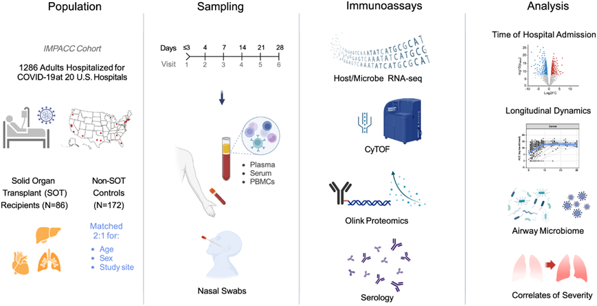 为了研究 SOT 接受者中与 COVID-19 相关的宿主免疫学和微生物特征,他们评估了入院后的血液中的质谱流式细胞数据 (CyTOF)、转录组分析(RNA-seq)、蛋白质组学和血清学分析数据,以及鼻拭子转录分析和宏转录组学数据,并在入院后长达约 28 天内纵向分析了多达 6 个时间点(图 1)