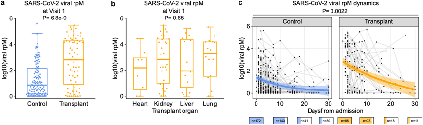 (a-b) 箱线图显示第 1 次访视时移植组和对照组的每百万 SARS-CoV-2 病毒读数(rpM),以及 不同器官移植类型。(c) 该图显示移植组和对照组入院后长达 30 天内病毒 rpM 的动态。