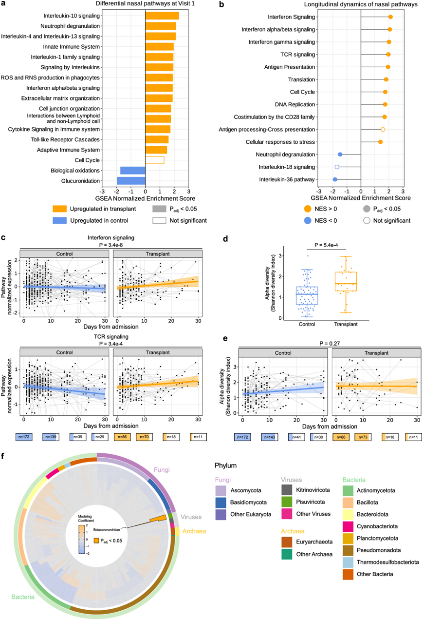 (a) 基因集富集分析 (GSEA) 突出显示了实体器官移植 (SOT) 接受者与对照组上呼吸道差异富集的通路。(b) 信号通路纵向动态的差异。(c) 纵向图突出显示了代表性免疫信号通路标准化表达的变化,这些变化在 SOT 接受者和对照组中显示出显著不同的动态。(d) 箱线图显示 SOT 接受者与对照组上呼吸道细菌微生物组 alpha 多样性的差异 。(e) 具有95% 置信区间的稳健回归突出显示住院后上呼吸道 alpha 多样性的纵向变化。(f) 径向图突出显示从属(最内圈) 到门(最外圈)的差异丰度和 SOT 接受者和对照组中差异富集的分类单元的系统发育相关性。